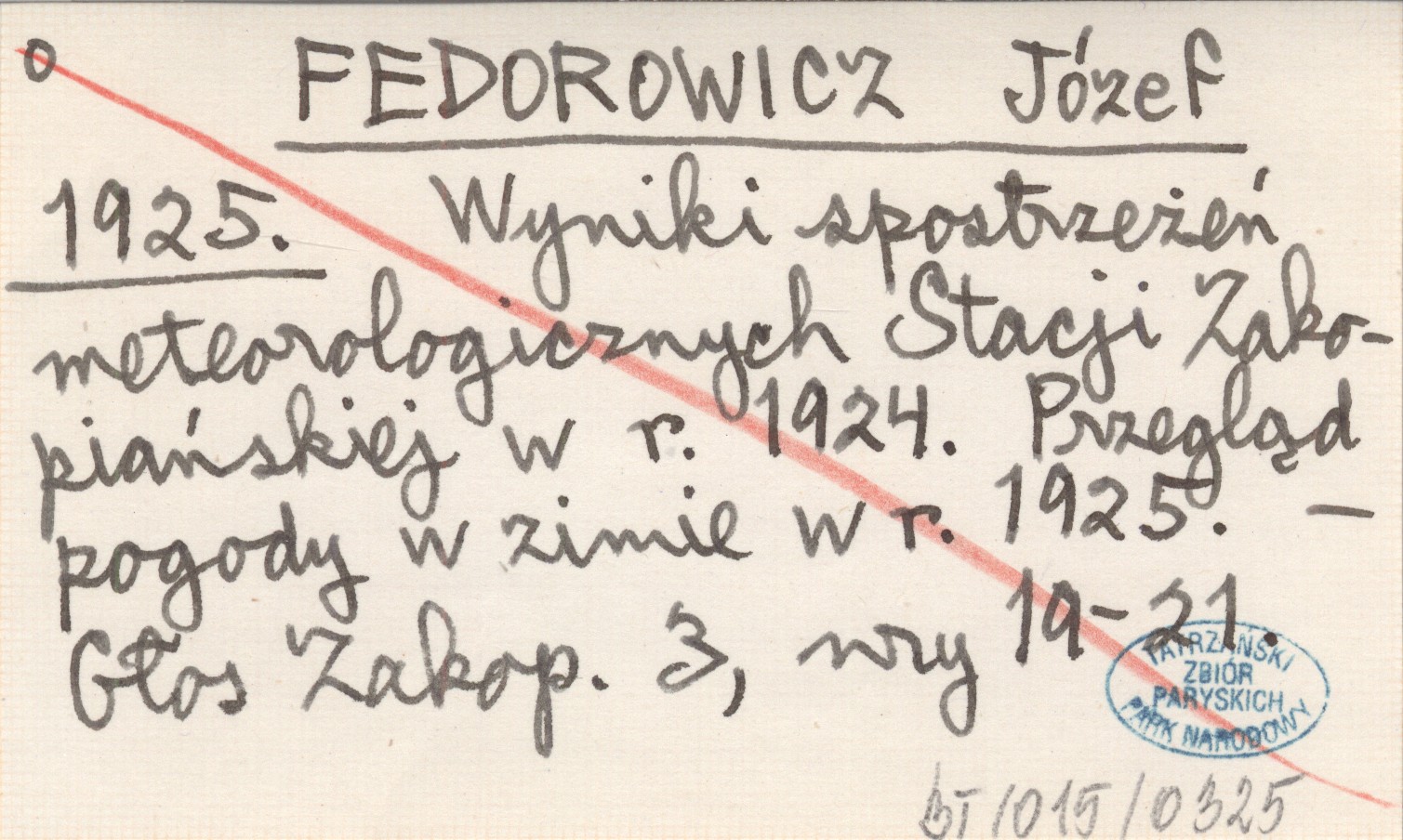 FEDOROWICZ Józef 1925 Wyniki spostrzeżeń meteorologicznych Stacji Zakopiańskiej w r. 1924. Przegląd pogody w zimie w r. 1925.