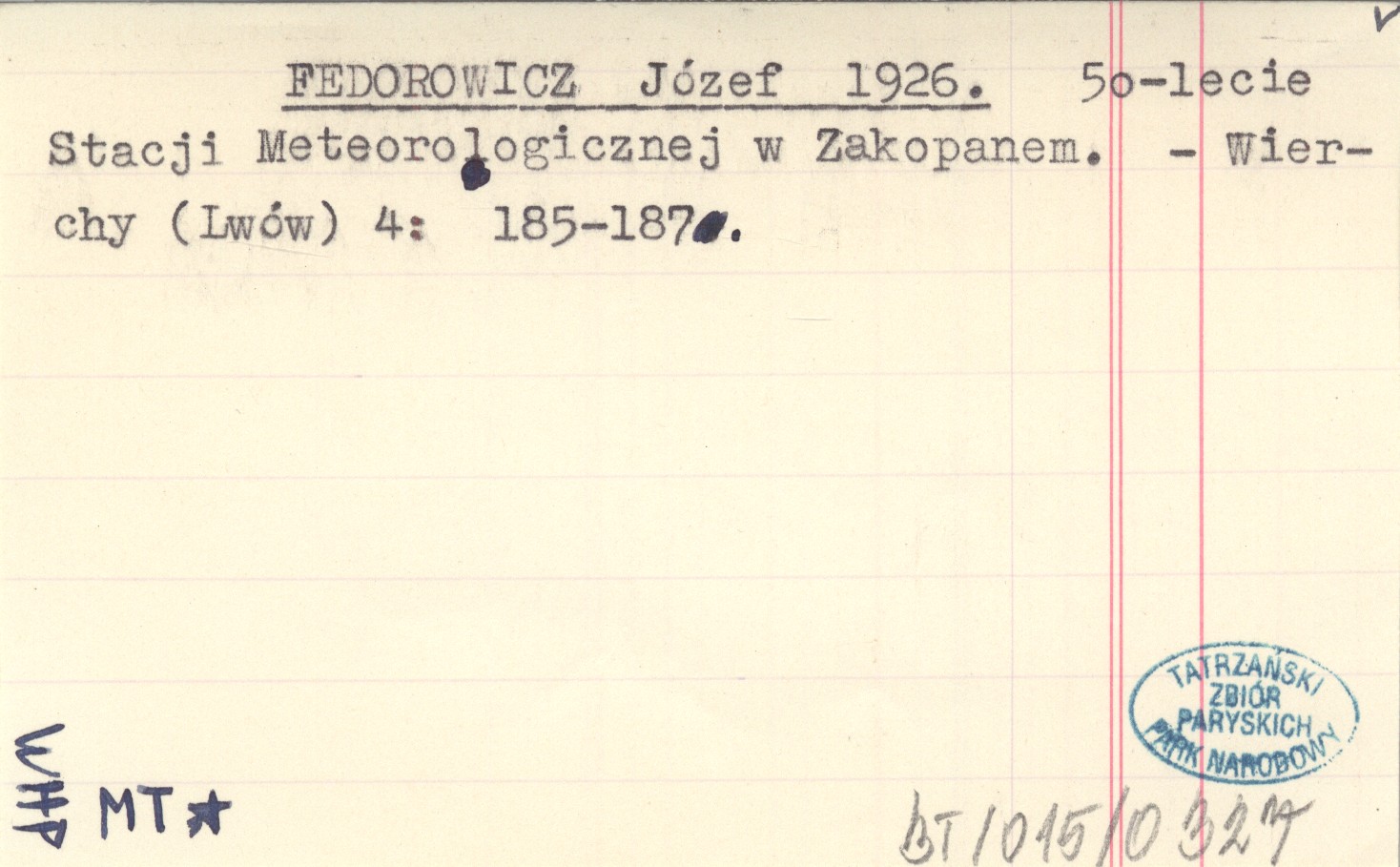 FEDOROWICZ Józef 1926 50-lecie Stacji Meteorologicznej w Zakopanem.