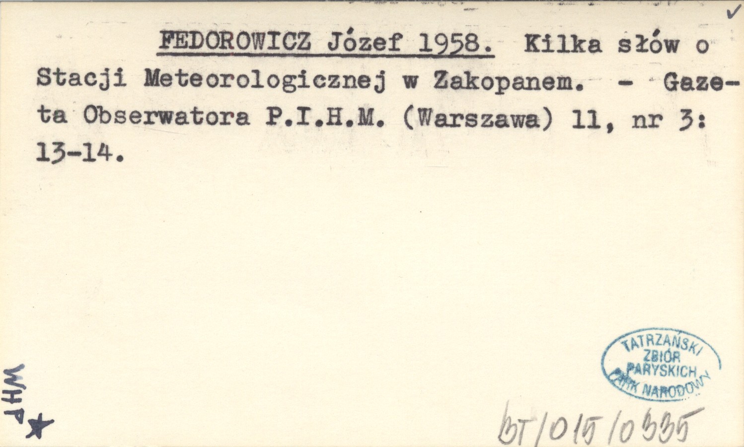 FEDOROWICZ Józef 1958 Kilka słów o Stacji Meteorologicznej w Zakopanem.
