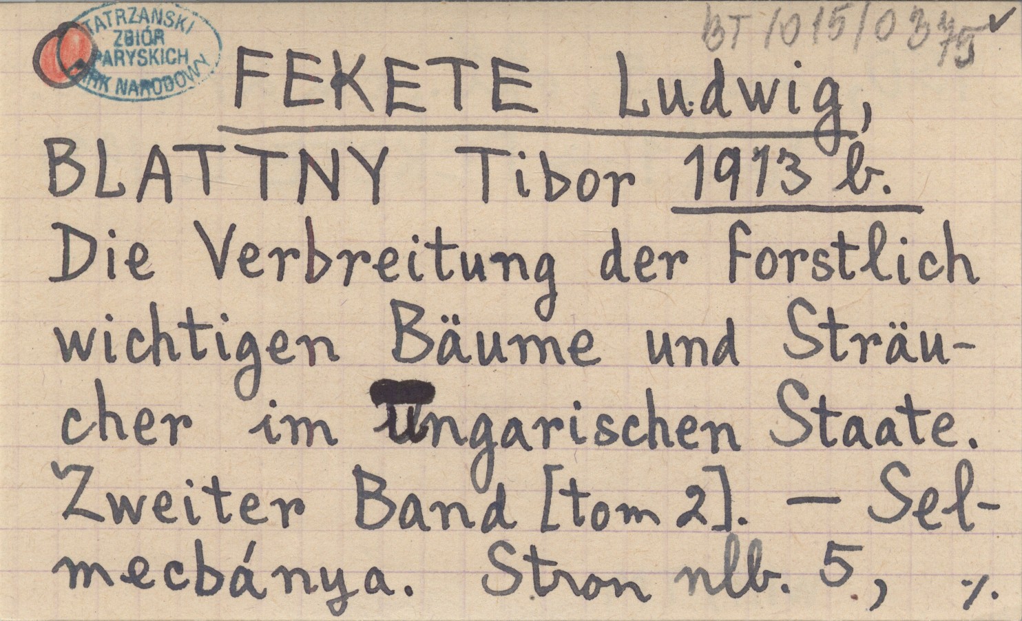 FEKETE Ludwig BLATTNY, Tibor. ; 1913 b Die Verbreitung der forstlich wichtigen Bäume und Sträucher im ungarischen Staate.