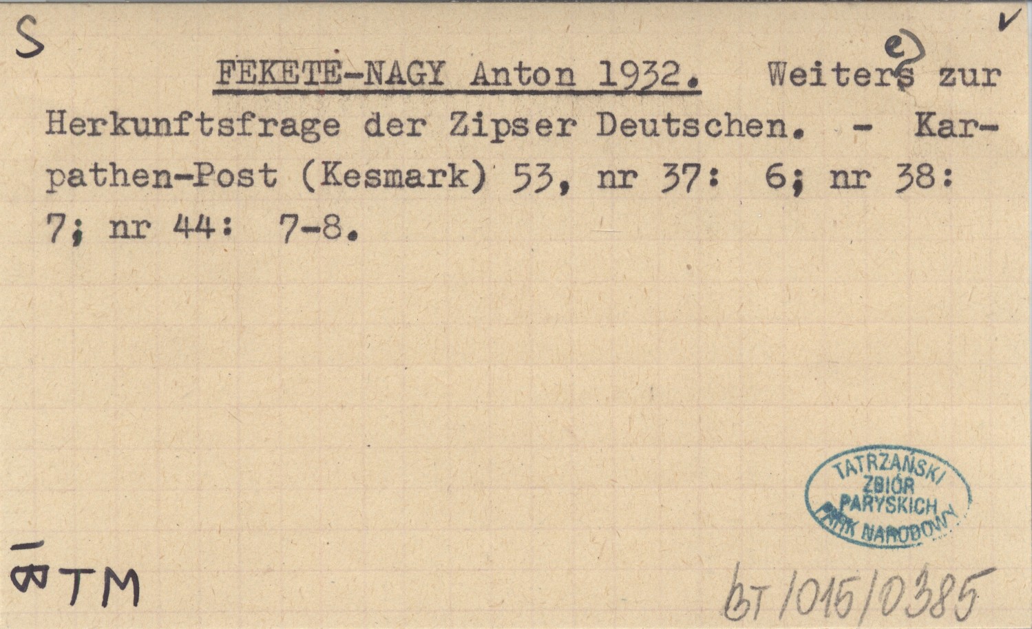 FEKETE NAGY Anton 1932 Weiteres zur Herkunftsfrage der Zipser Deutschen.
