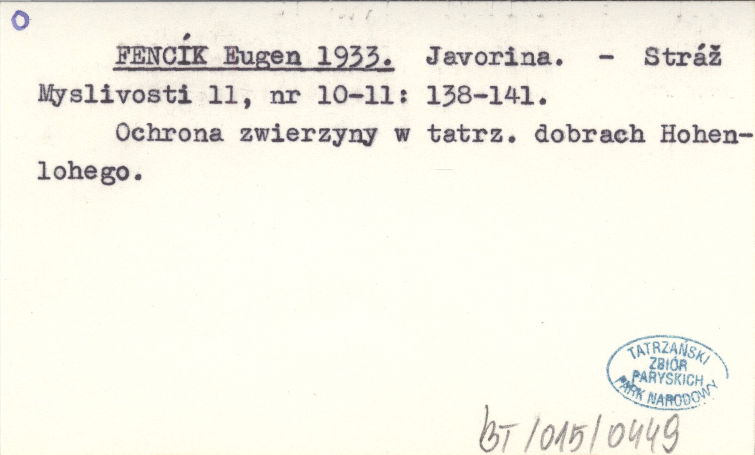 Stráž Myslivosti, 11, nr 10-11: 138-141. Ochrona zwierzyny w tatrzańskich dobrach Hohenlohego.