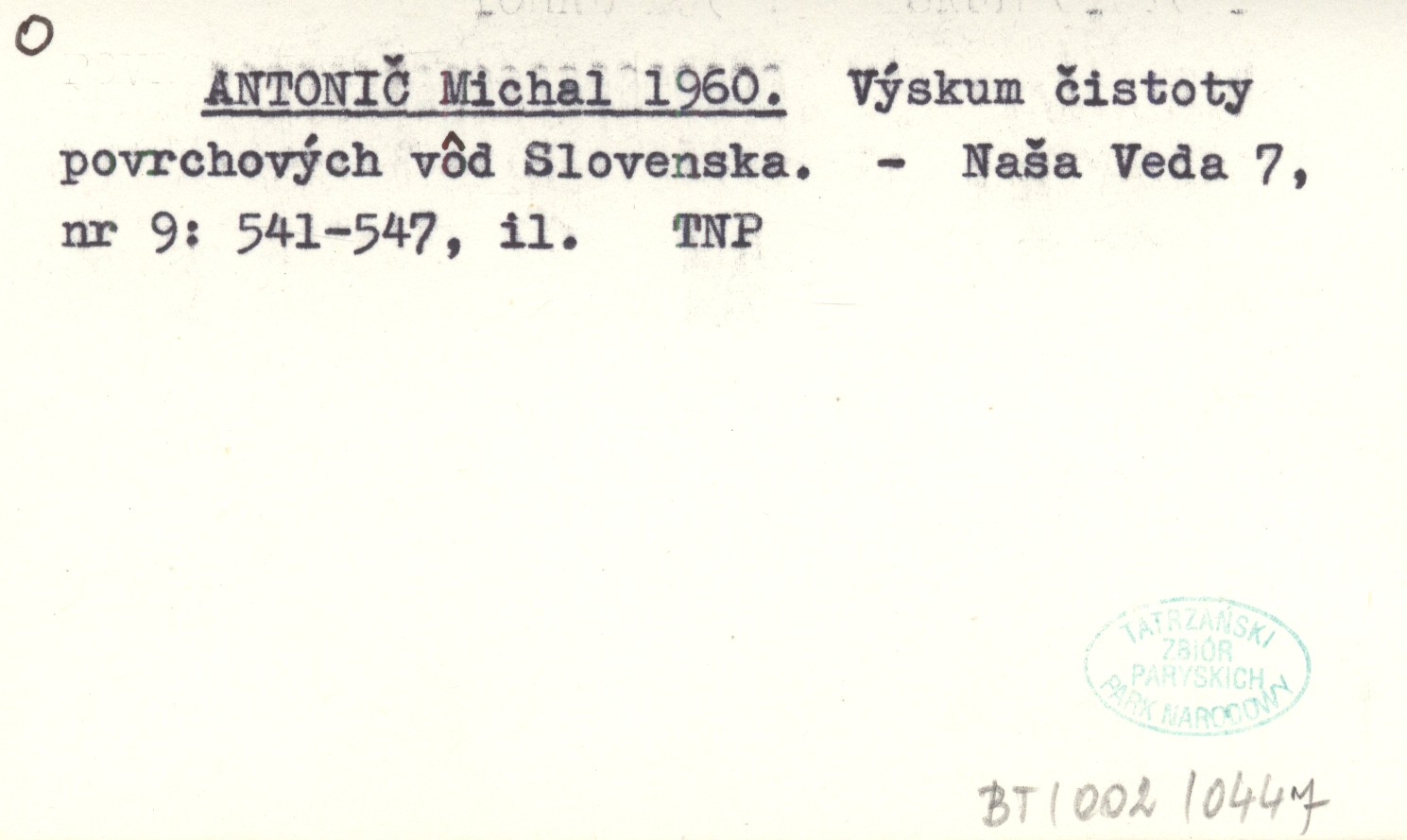 ANTONIČ Michal 1960 Výskum čistoty povrchových vôd Slovenska.