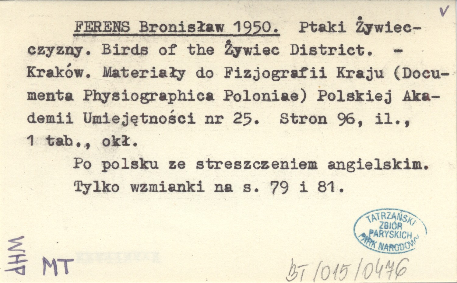 FERENS Bronisław 1950 Ptaki Żywiecczyzny. Birds of the Żywiec District.