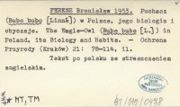 FERENS Bronisław 1953 Puchacz (Bubo bubo [Linné]) w Polsce, jego biologia i obyczaje. The Eagle-Owl (Bubo bubo [L.]) in Poland, its Biology and Habits.