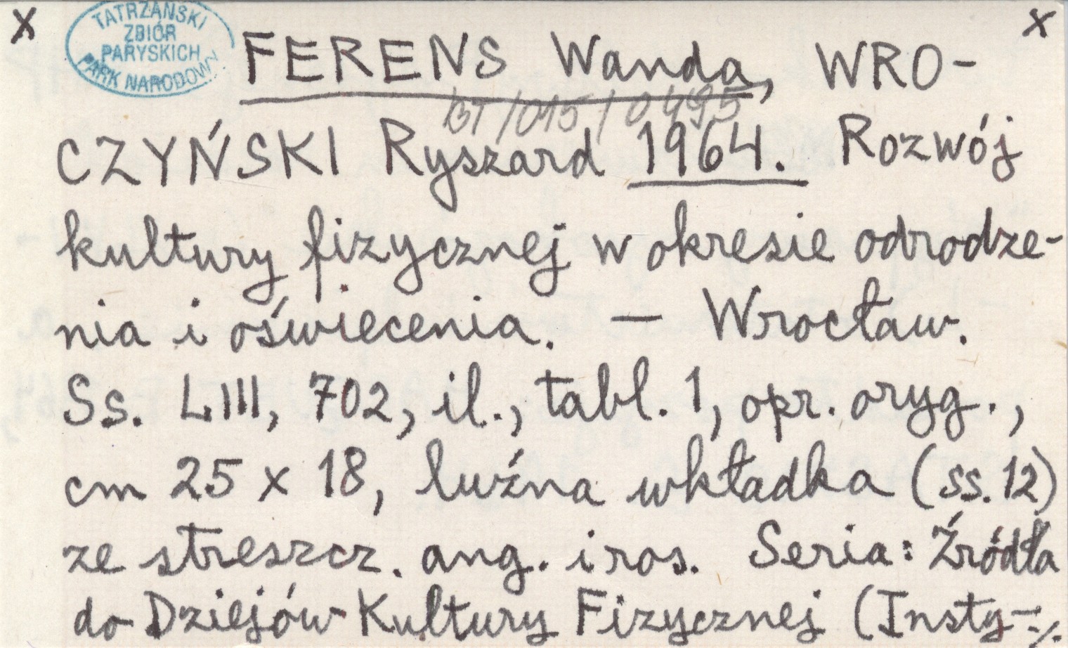 FERENS Wanda WROCZYŃSKI, Ryszard. ; 1964 Rozwój kultury fizycznej w okresie odrodzenia i oświecenia.