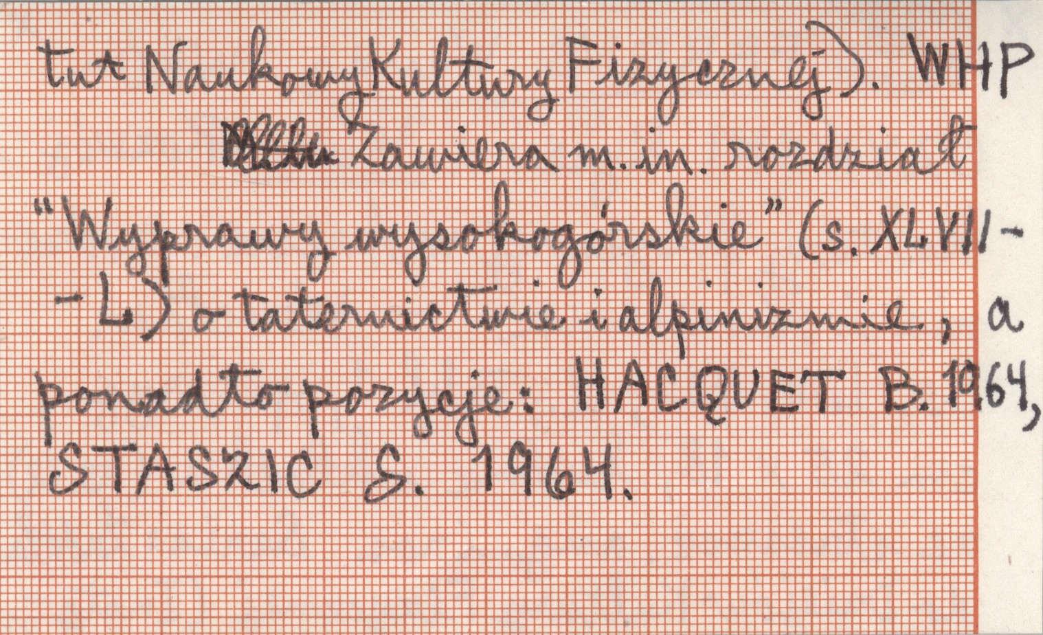 Wrocław (Żródła do Dziejów Kultury Fizycznej, Instytut Naukowy Kultury Fizycznej) , LIII, 702 s., il., 1 k., opr. oryg., 25x18 cm, luźna wkładka (12 s.) ze streszcz. ang. i ros. Zawiera m. in. rozdział "Wyprawy wysokogórskie" (s. XLVII-L) o taternictwie i alpinizmie, a ponadto pozycję: HACQUET B. 1964, STASZIC S. 1964.