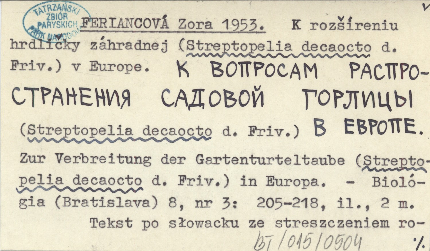 FERIANCOVÁ Zora 1953 K rozšíreniu hrdličky záhradnej (Streptopelia decaocto d. Friv.) v Europe. K voprosam rasprostranenija sadovoj gorlicy (Streptopelia decaocto d. Friv.) v Evrope. Zur Verbreitung der Gartenturteltaube (Streptopelia decaocto d. Friv.) in Europa.