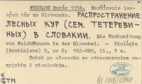 FERIANC Oskár 1954 Roząírenie lesných kúr na Slovensku. Rasprostranenie lesnych kur (sem. teterevinych) v Slovakii. Die Verbreitung von Waldhühnern in der Slowakei.