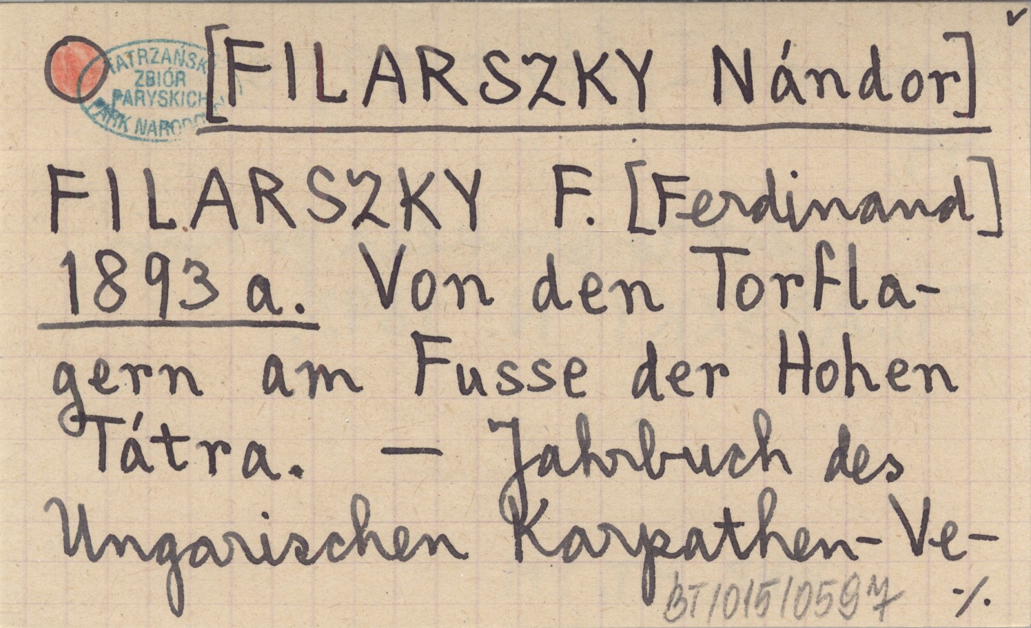 FILARSZKY F. [Ferdinand] [FILARSZKY Nándor] 1893 a Von den Torflagern am Fusse der Hohen Tátra.