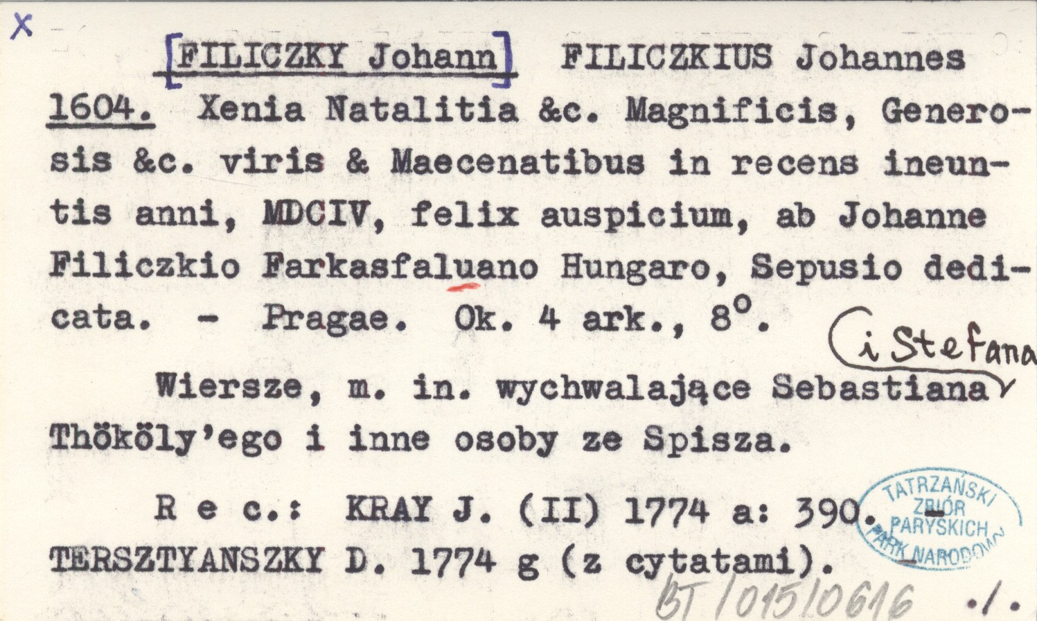 Pragae , Ok. 4 ark., 8°. Wiersze, m. in. wychwalające Sebastiana i Stefana Thököly'ego i inne osoby ze Spisza. REC: KRAY J. (II) 1774 a: 390 ; TERSZTYANSZKY D. 1774 g (z cytatami) ; MELZER J. 1833: 61.
