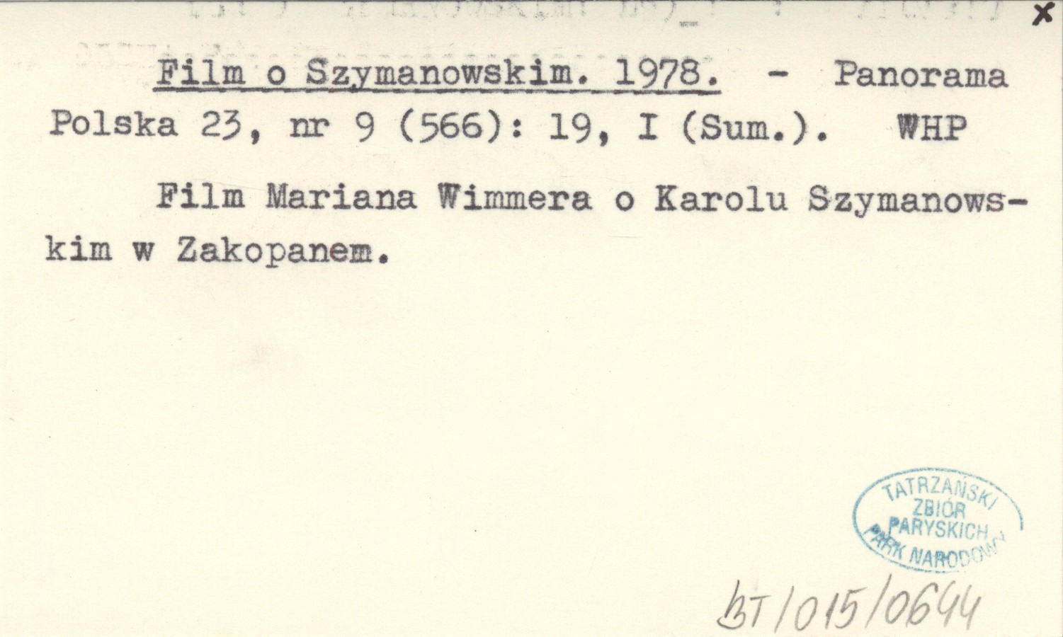 Panorama Polska, 23, nr 9 (566): 19, I (Sum.). Film Mariana Wimmera o Karolu Szymanowskim w Zakopanem.