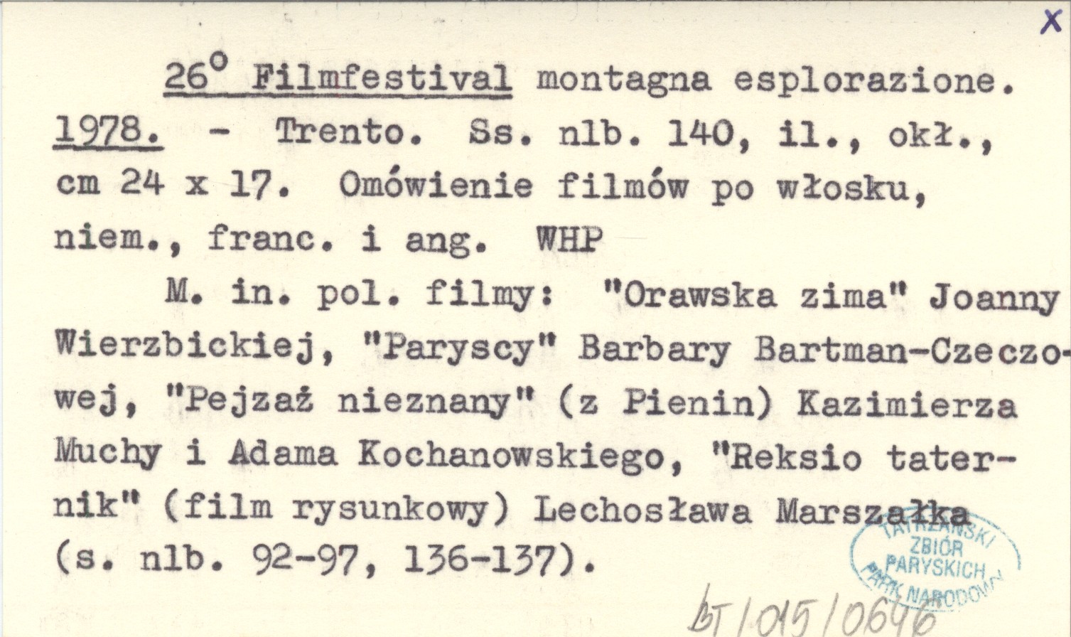 Trento , [140] s., il., okł., 24x17 cm. Omówienie filmów po włosku, niem., franc. i ang. M. in. pol. filmy: "Orawska zima" Joanny Wierzbickiej, "Paryscy" Barbary Bartman-Czeczowej, "Pejzaż nieznany" (z Pienin) Kazimierza Muchy i Adama Kochanowskiego, "Reksio taternik" (film rysunkowy) Lechosława Marszałka (s. [92]-[97], [136]-[137]).