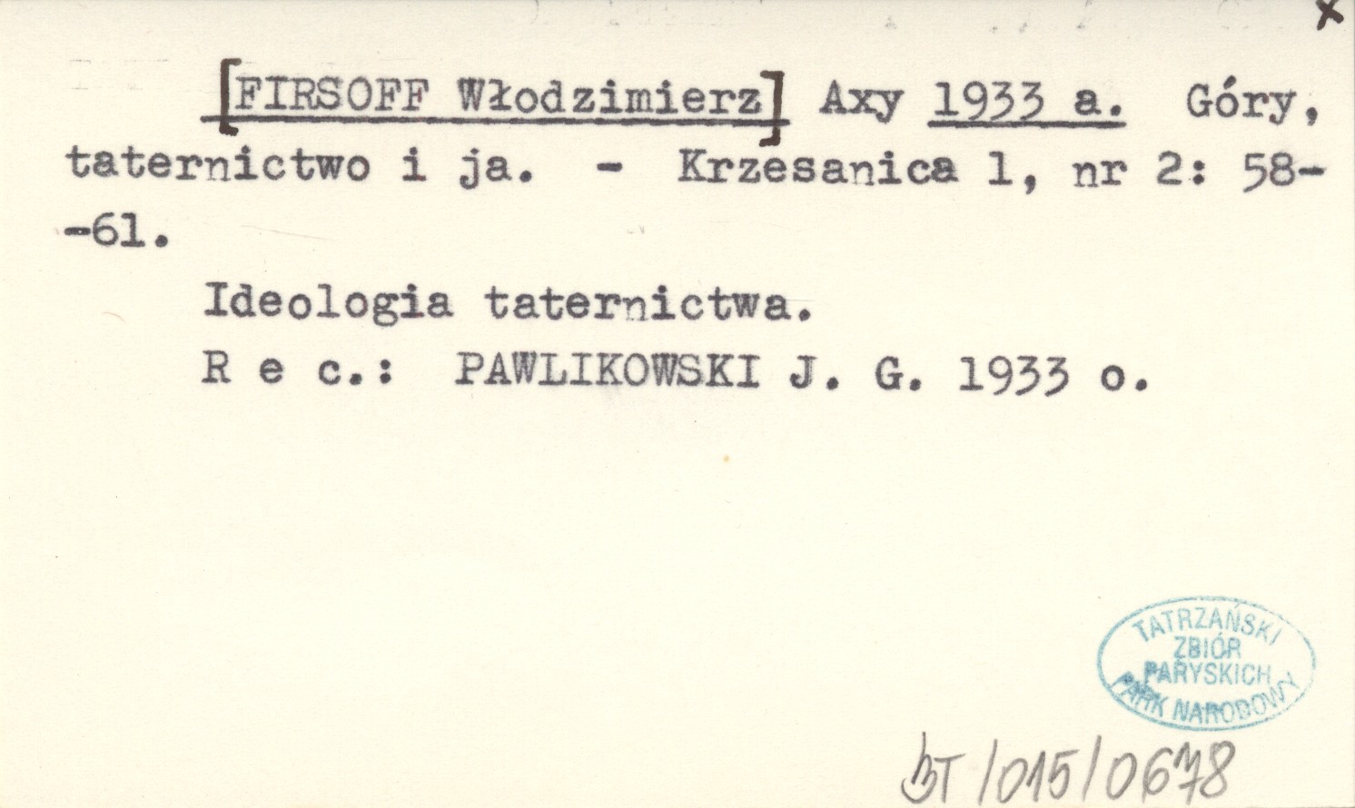 Krzesanica, 1, nr 2: 58-61. Ideologia taternictwa. REC: PAWLIKOWSKI J. G. 1933 o