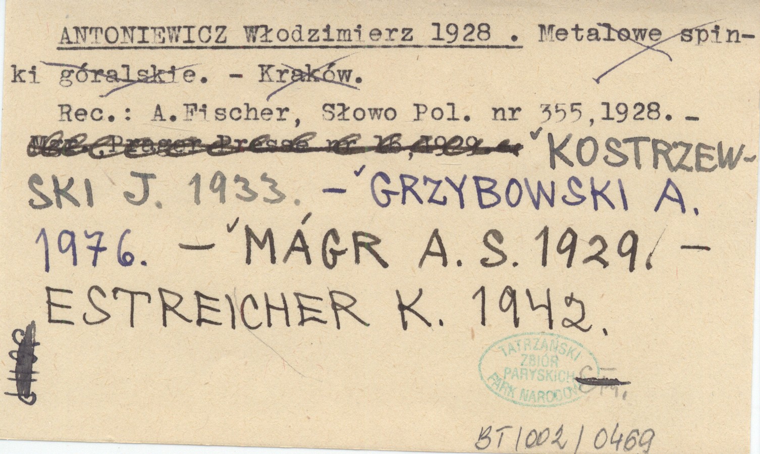 Kraków , REC: A. FISCHER, Słowo Polskie 1928, nr 355 ; KOSTRZEWSKI J. 1933 ; GRZYBOWSKI A. 1976 ; MÁGR A. S. 1929 ; ESTREICHER K. 1942 ;