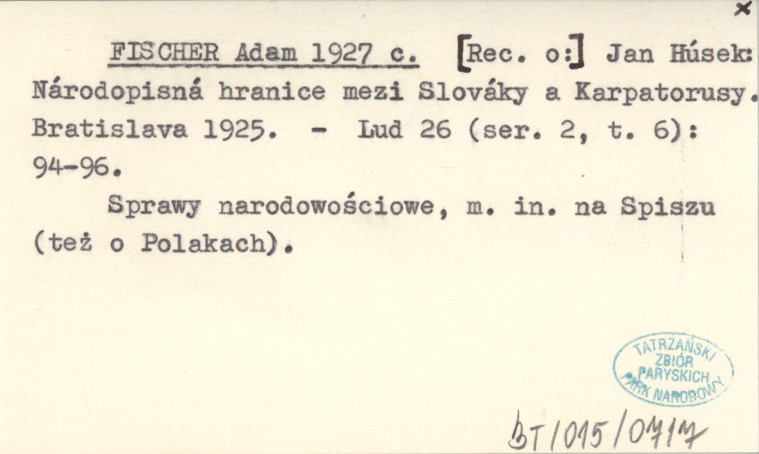 FISCHER Adam 1927 c [Rec. o:] Jan Húsek: Národopisná hranice mezi Slováky a Karaptorusy. Bratislava 1925.