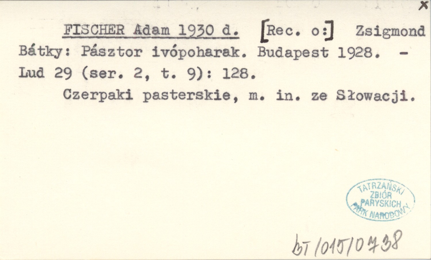 FISCHER Adam 1930 d [Rec. o:] Zsigmond Bátky: Pásztor ivópoharak. Budapest 1928.