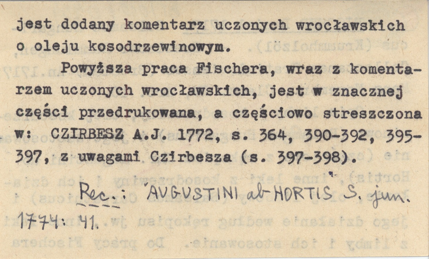 Breslauer Sammlungen, Collectanea Wratislavienses (Breslau) , An. 1717, Mens Novembr., Class. IV, Art. 10. Opis limby i kosodrzewiny, olej kosodrzewinowy (Balsamus Hungaricus) i jej zastosowanie (częściowo z rękopisu Chr. Augustini ab Hortis), inne leki z kosodrzewiny i ich działanie, olej limbowy (Balsamus Carpathicus) i jego działanie według rękopisu jw., inne leki z limby i ich zastosowanie. Do pracy Fischera jest dodany komentarz uczonych wrocławskich o oleju kosodrzewinowym. Powyższa praca Fischera, wraz z komentarzem uczonych wrocławskich, jest w znacznej części przedrukowana, a częściowo streszczona w: CZIRBESZ A. J. 1772: 364, 390-392, 395-397, z uwagami Czirbesza (s. 397-398). REC: AUGUSTINI ab HORTIS S. jun. 1774: 41.
