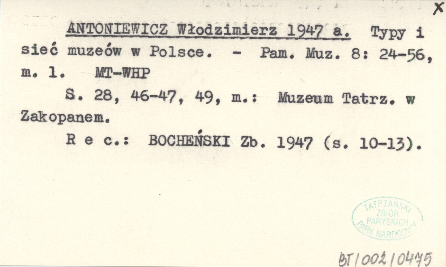 Pamiętnik Muzealny, 8: 24-56, 1 mapa. S. 28, 46-47, 49, m.: Muzeum Tatrz. w Zakopanem. REC: BOCHEŃSKI Zb. 1947 (s. 10-13).