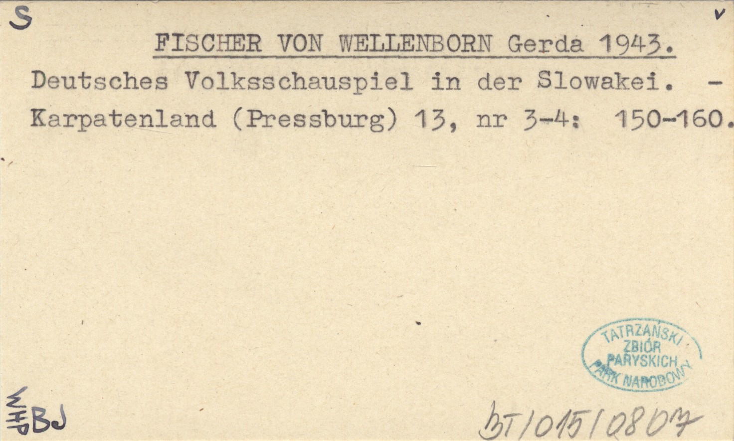 FISCHER VON WELLENBORN Gerda 1943 Deutsches Volksschauspiel in der Slowakei.