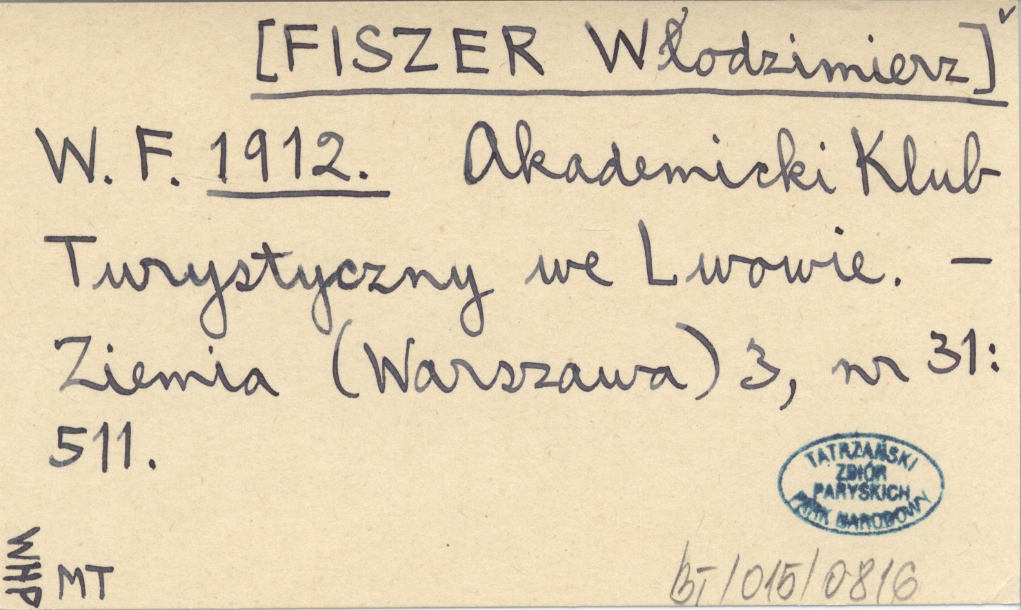 W. F. [FISZER Włodzimierz] 1912 Akademicki Klub Turystyczny we Lwowie.