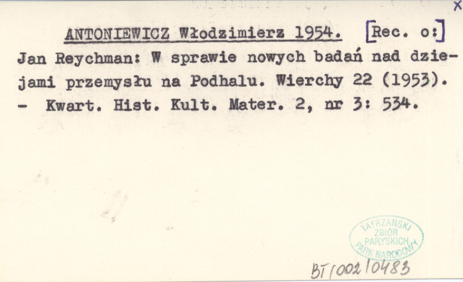 ANTONIEWICZ Włodzimierz 1954 [Rec. o:] Jan Reychman: W sprawie nowych badań nad dziejami przemysłu na Podhalu. Wierchy 22 (1953)