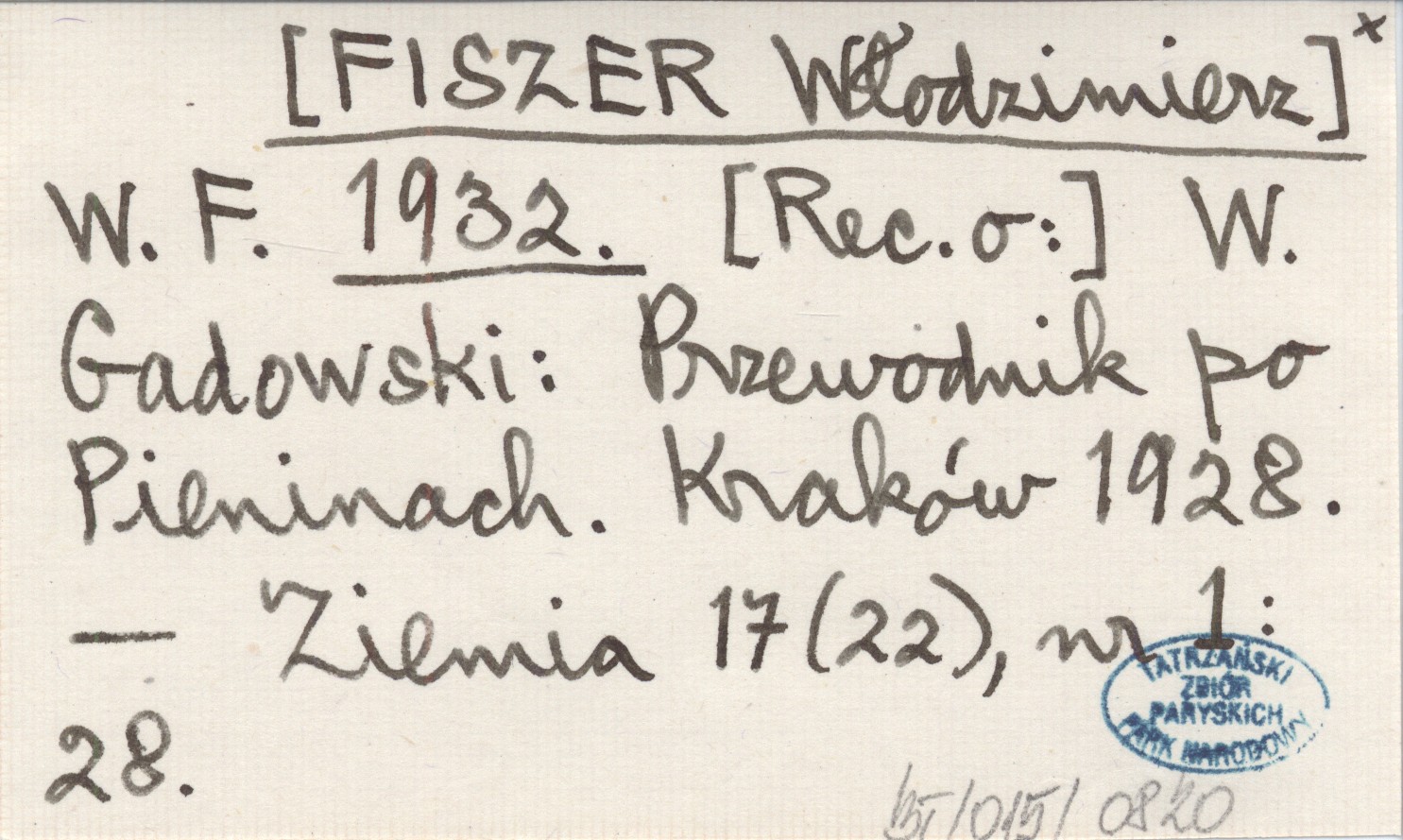 W. F. [FISZER Włodzimierz] 1932 [Rec. o:] W. Gadowski: Przewodnik po Pieninach. Kraków 1928.
