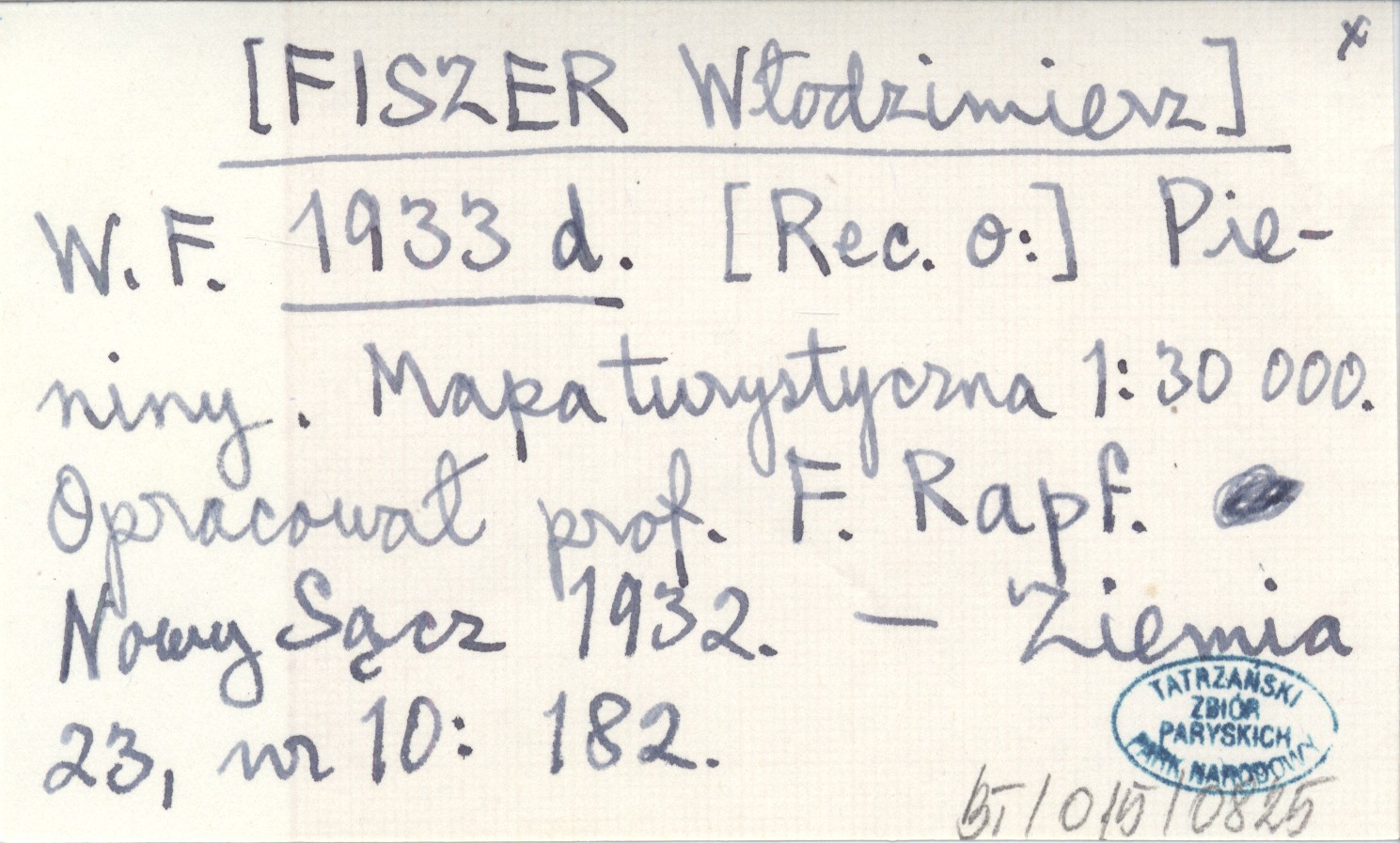 W. F. [FISZER Włodzimierz] 1933 d [Rec. o:] Pieniny. Mapa turystyczna 1:30 000. Opracował prof. F. Rapf. Nowy Sącz 1932.