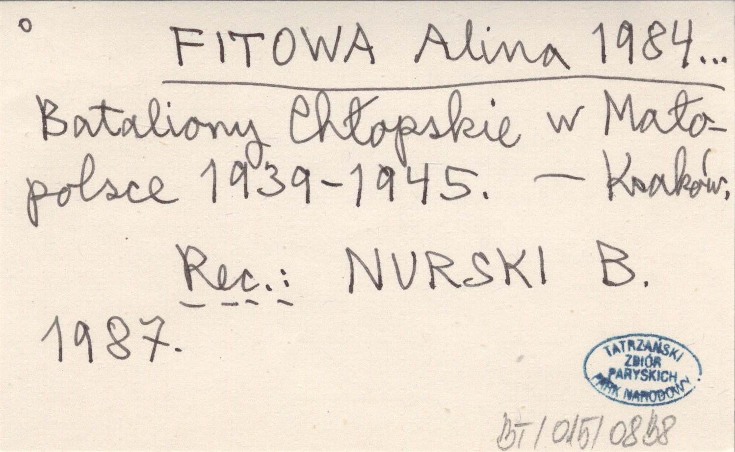 FITOWA Alina 1984... Bataliony Chłopskie w Małopolsce 1939-1945.
