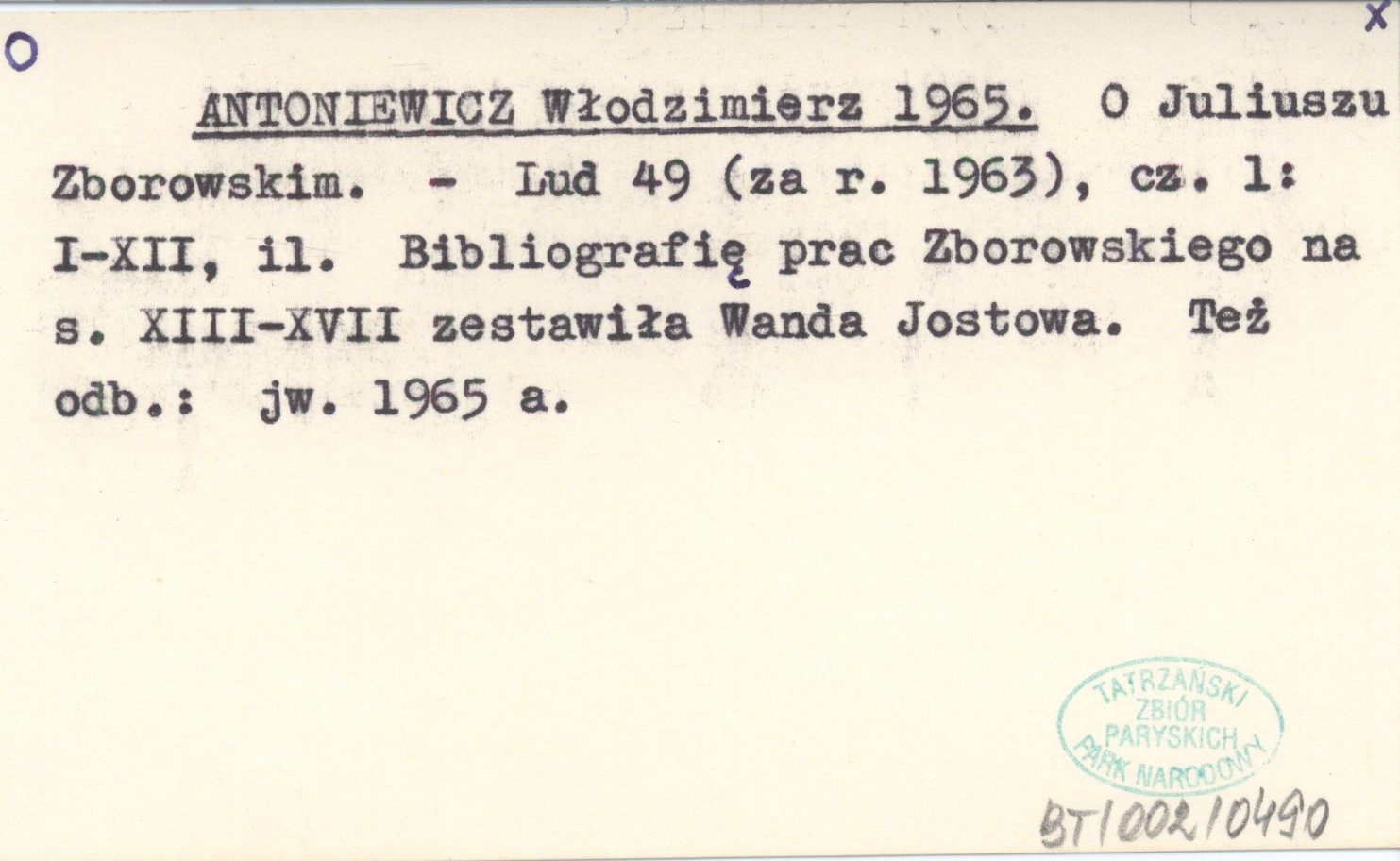 Lud, 49 (za r. 1963), cz. 1: I-XII, il. Bibliografię prac Zborowskiego na s. XIII-XVII zestawiła Wanda Jostowa. Też odb.: jw. 1965 a