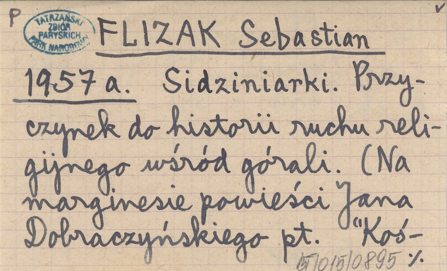 FLIZAK Sebastian 1957 a Sidziniarki. Przyczynek do historii ruchu religijnego wśród górali. (Na marginesie powieści Jana Dobraczyńskiego pt. "Kościół w Chochołowie".).