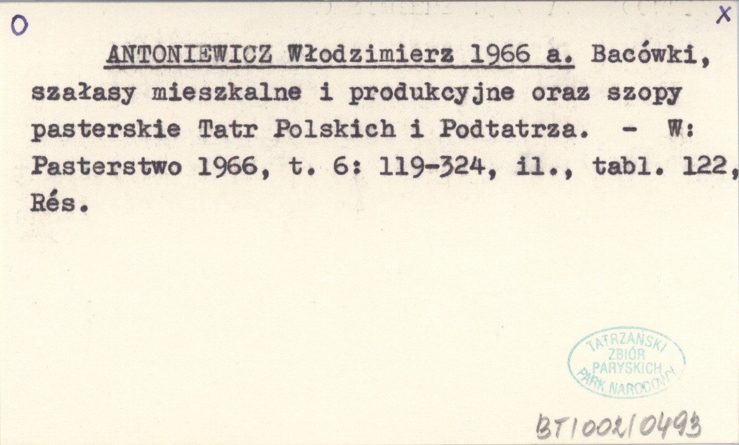 ANTONIEWICZ Włodzimierz 1966 a Bacówki, szałasy mieszkalne i produkcyjne oraz szopy pasterskie Tatr Polskich i Podtatrza.