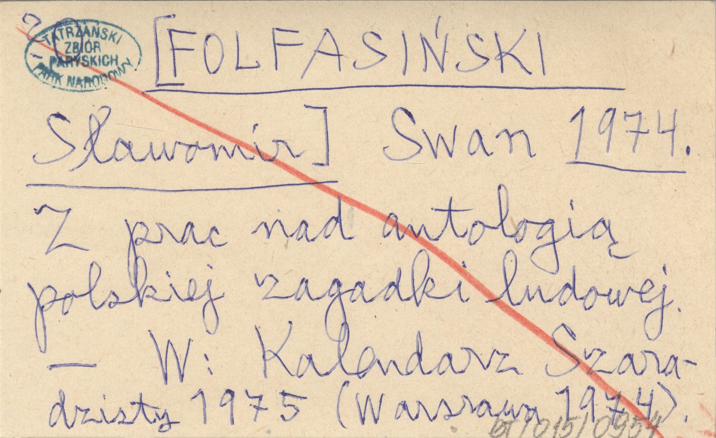 Swan [FOLFASIŃSKI Sławomir] 1974 Z prac nad antologią polskiej zagadki ludowej.