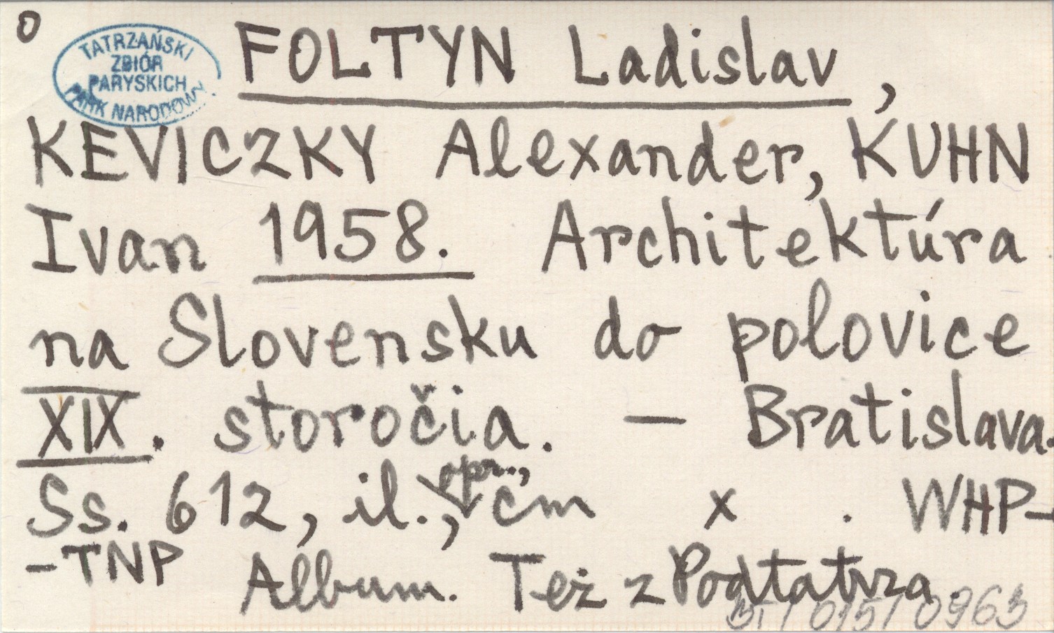 FOLTYN Ladislav KEVICZKY, Alexander. ; KUHN, Ivan. ; 1958 Architektúra na Slovensku do polovice XIX. storočia.