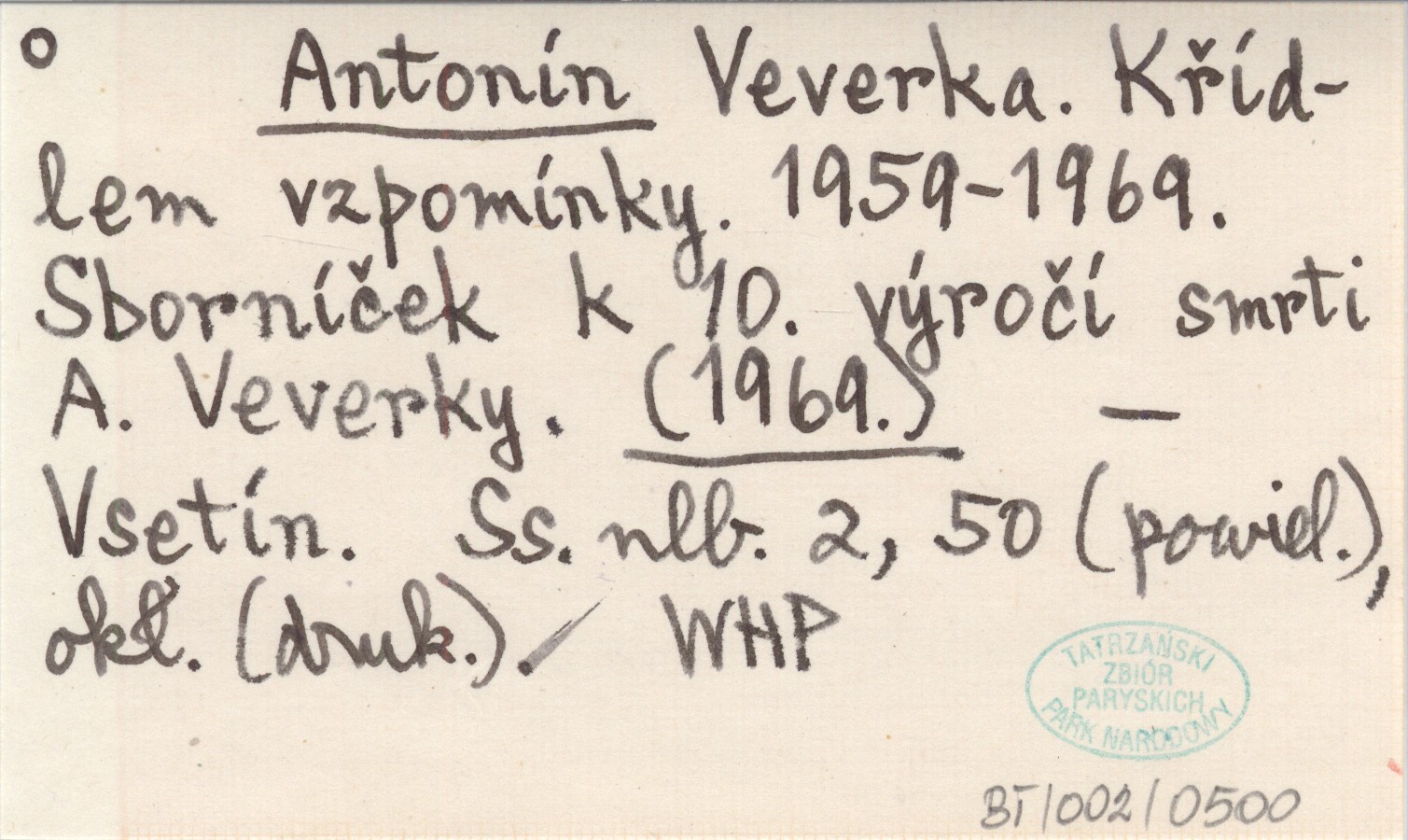 Antonín Veverka. Křídlem vzpomínky. 1959-1969. Sborníček k. 10. výročí smrti A. Veverky. 1969