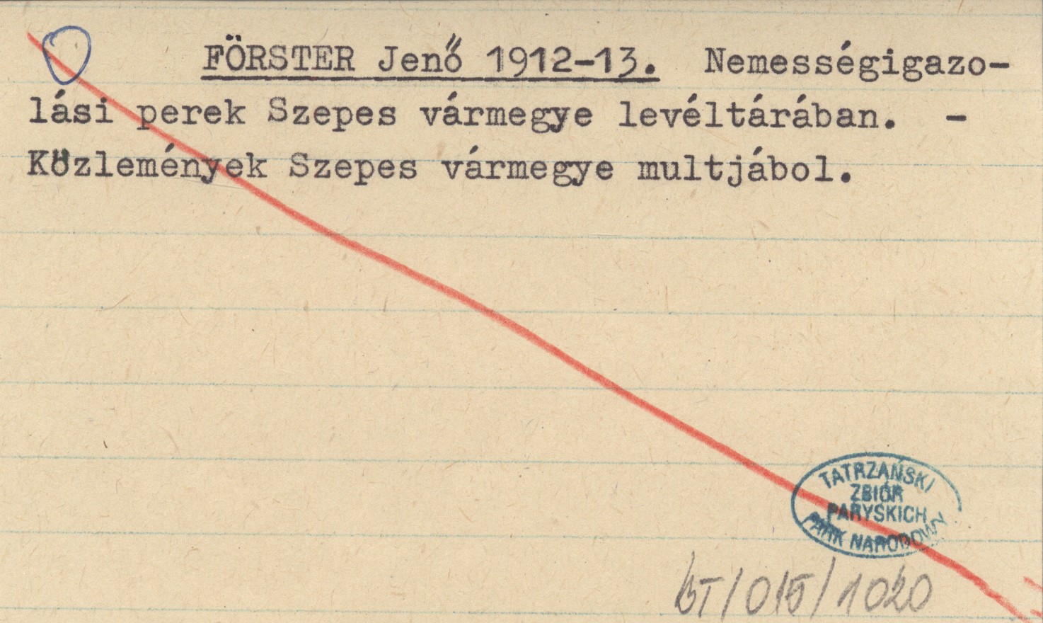 FÖRSTER Jenő 1912-13 Nemességigazolási perek Szepes vármegye levéltárában.