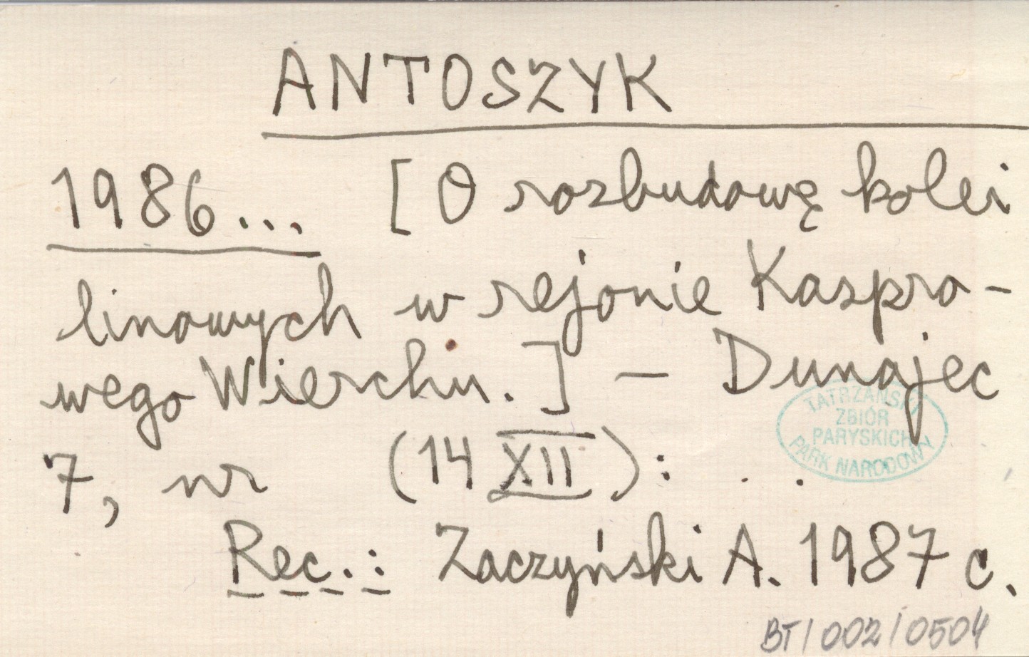 ANTOSZYK 1986... [O rozbudowie kolei linowych w rejonie Kasprowego Wierchu.]