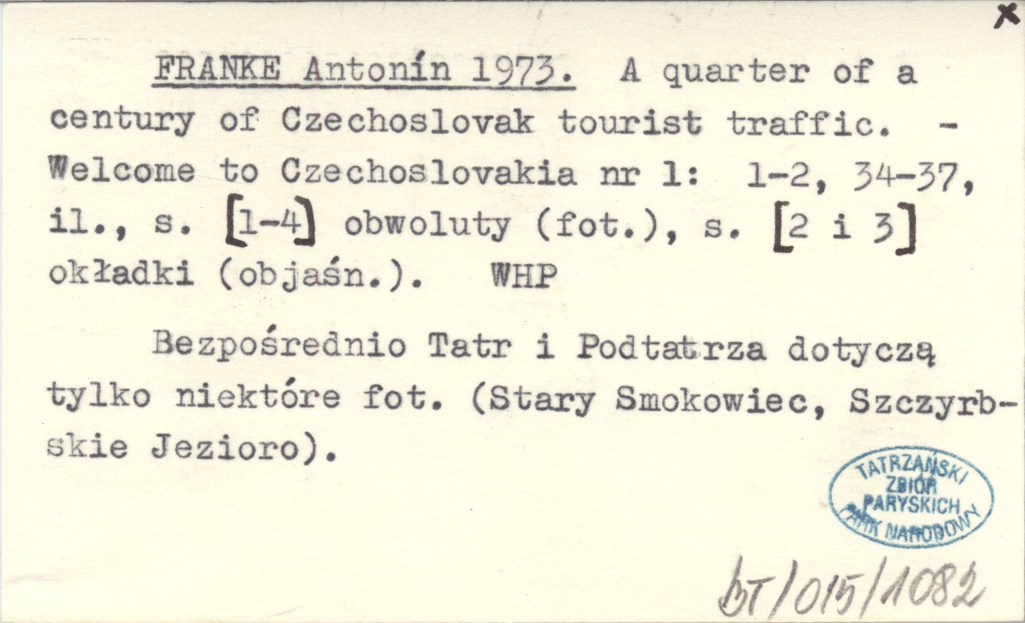 Welcome to Czechoslovakia, Nr 1: 1-2, 34-37, il., [1-4] obw. (fot.), [2, 3] okł. (obj.). Bezpośrednio Tatr i Podtatrza dotyczą tylko niektóre fot. (Stary Smokowiec, Szczyrbskie Jezioro).