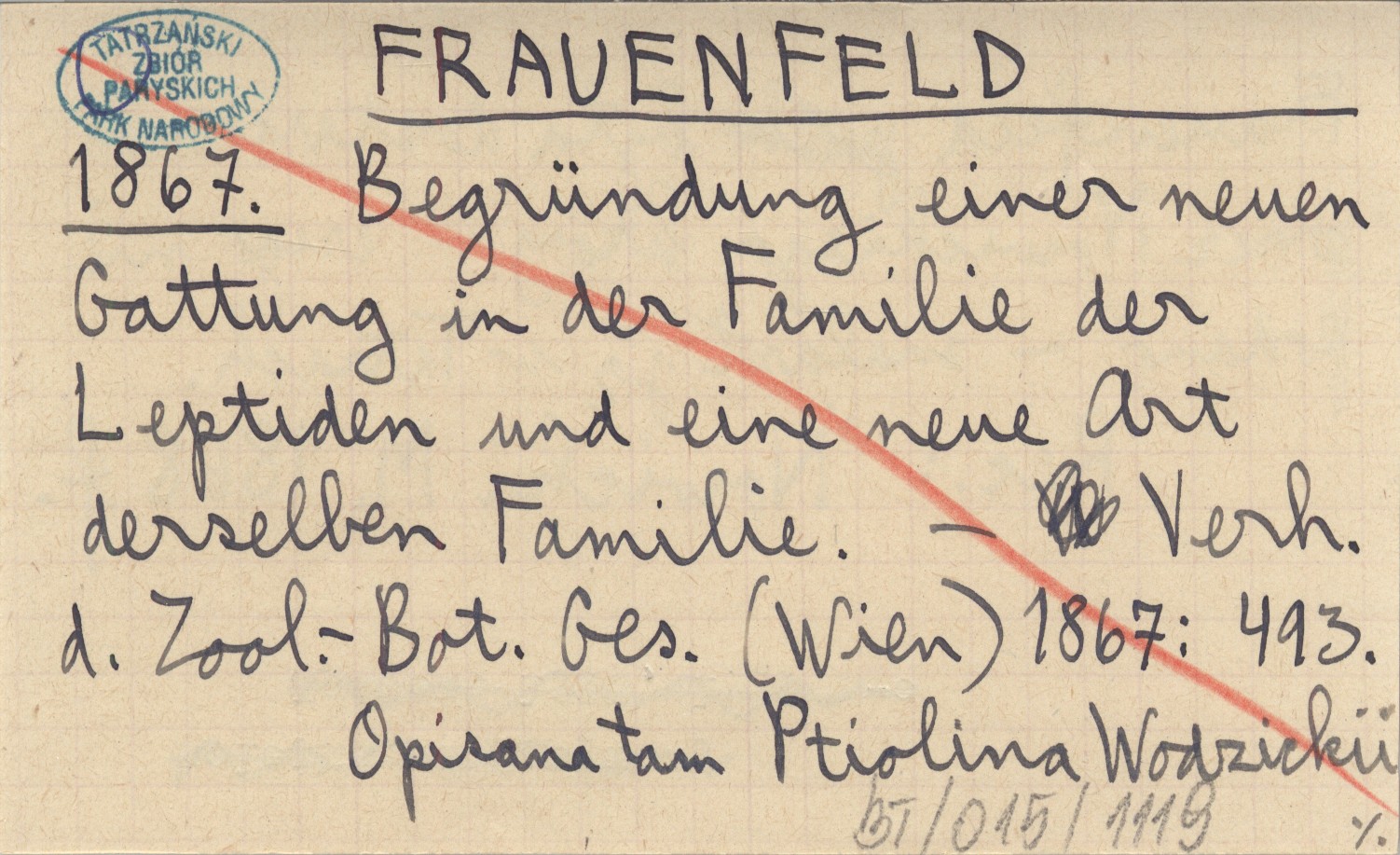Verh. d. Zool.-Bot. Ges. (Wien) , S. 493. Opisana tam Ptiolina Wodzickii Frauenfeld była dostarczona przez Nowickiego, który - czego nie podano - znalazł ją w Tatrach. REC: NOWICKI M. 1868 f