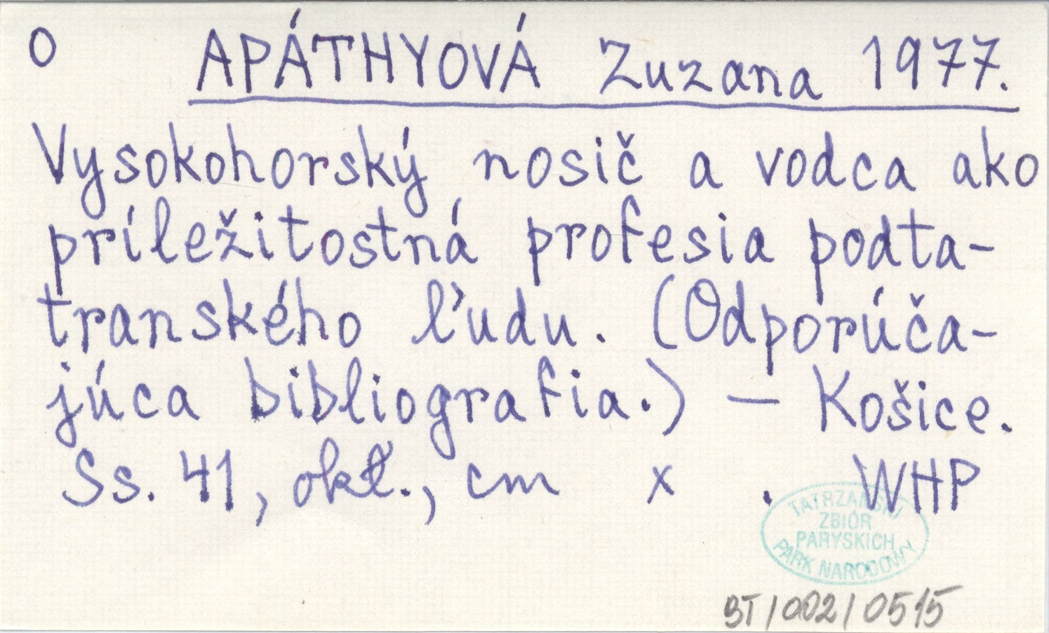 APĮTHYOVĮ Zuzana 1977 Vysokohorskż nosič a vodca ako prķle¾itostnį profesia podtatranského µudu. (Odporśčajśca bibliografia).