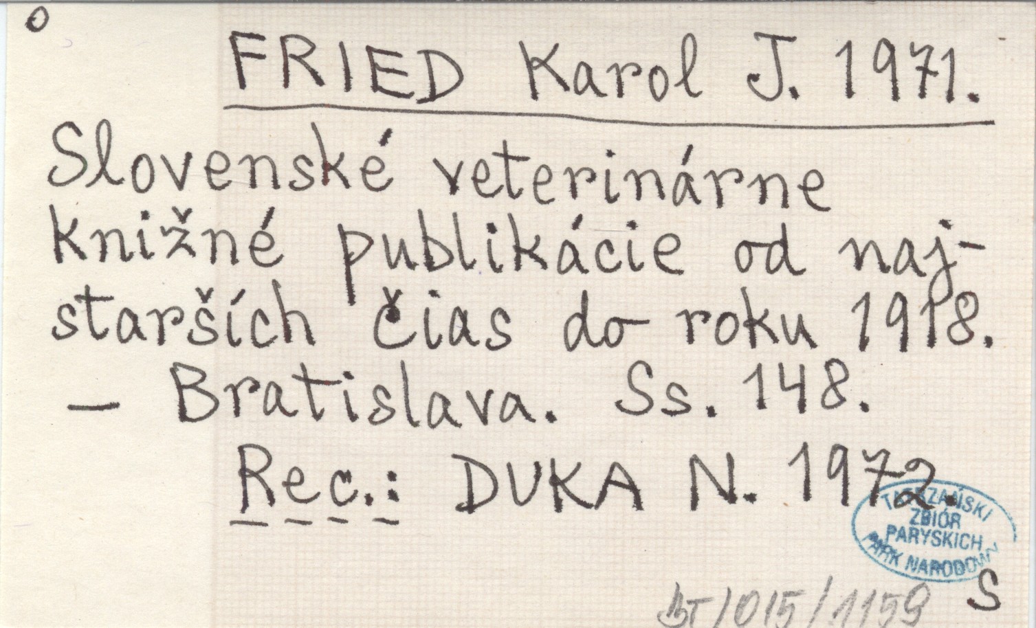 FRIED Karol J. 1971 Slovenské veterinárne knižné publikácie od najstarších čias do roku 1918.