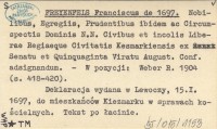 FREYENFELS Franciscus de 1697 Nobilibus, Egregiis, Prudentibus ibidem ac Circumspectis Dominis N.N. Civibus et incolis Liberae Regiaeque Civitatis Kesmarkiensis ex Senatu et Quinquaginta Viratu August. Conf. adsignandum.