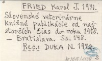 FRIED Karol J. 1971 Slovenské veterinárne knižné publikácie od najstarších čias do roku 1918.