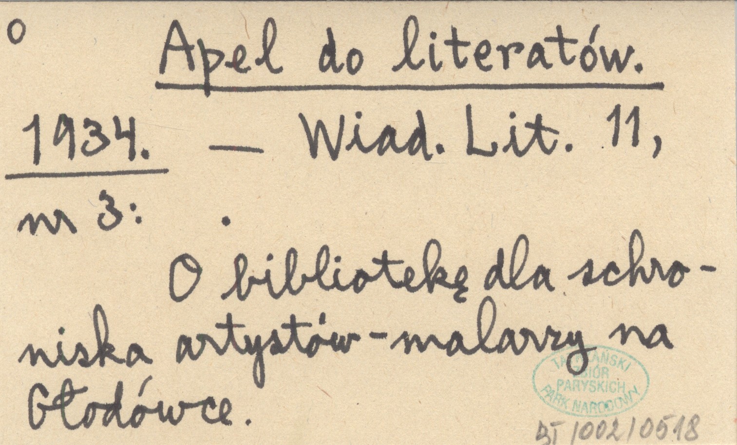 Wiadomości Literackie, 11, nr 3. O bibliotekę dla schroniska artystów-malarzy na Głodówce.