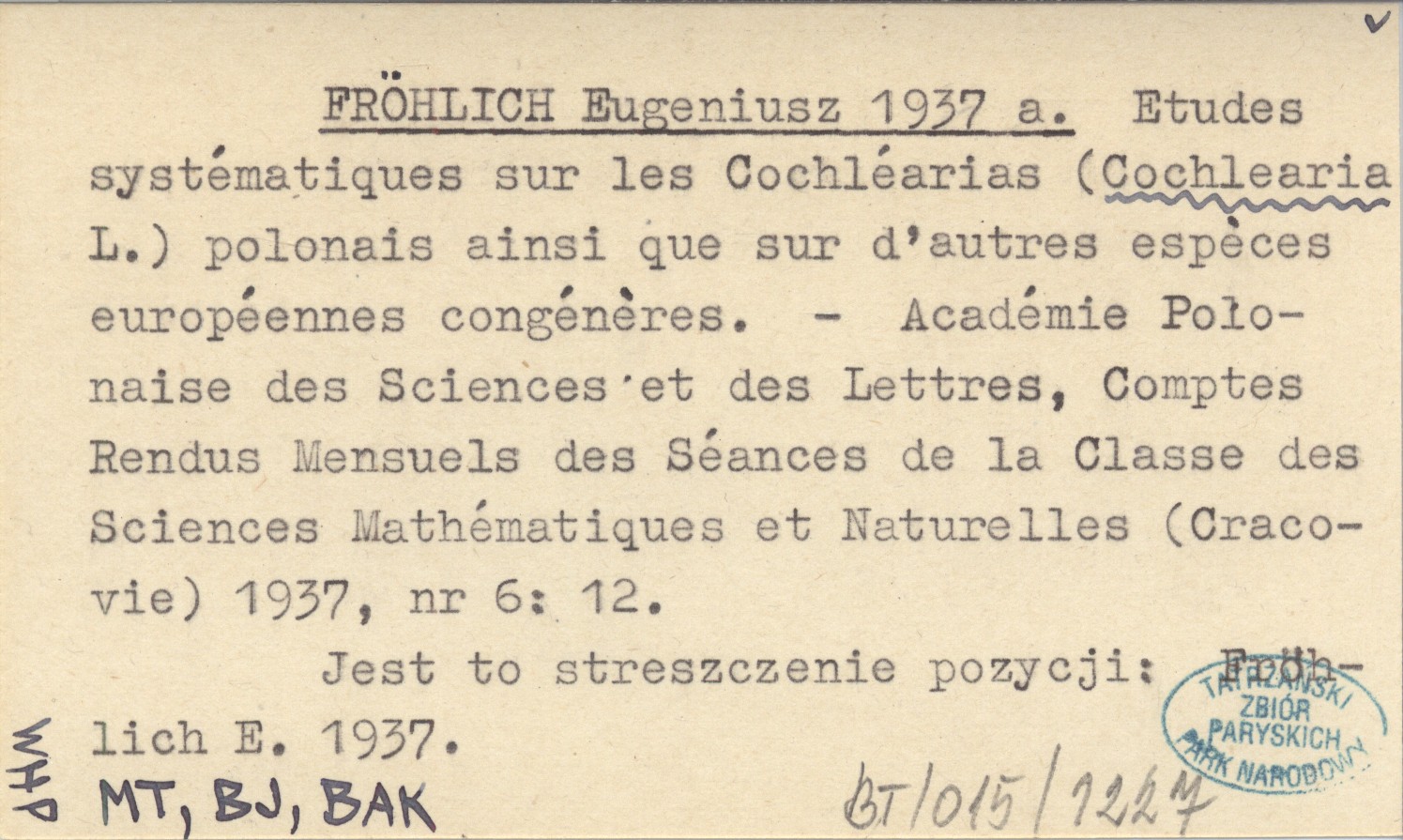 FRÖHLICH Eugeniusz 1937 a Etudes systématiques sur les Cochléarias (Cochlearia L.) polonais ainsi que sur d'autres espéces européennes congénéres.