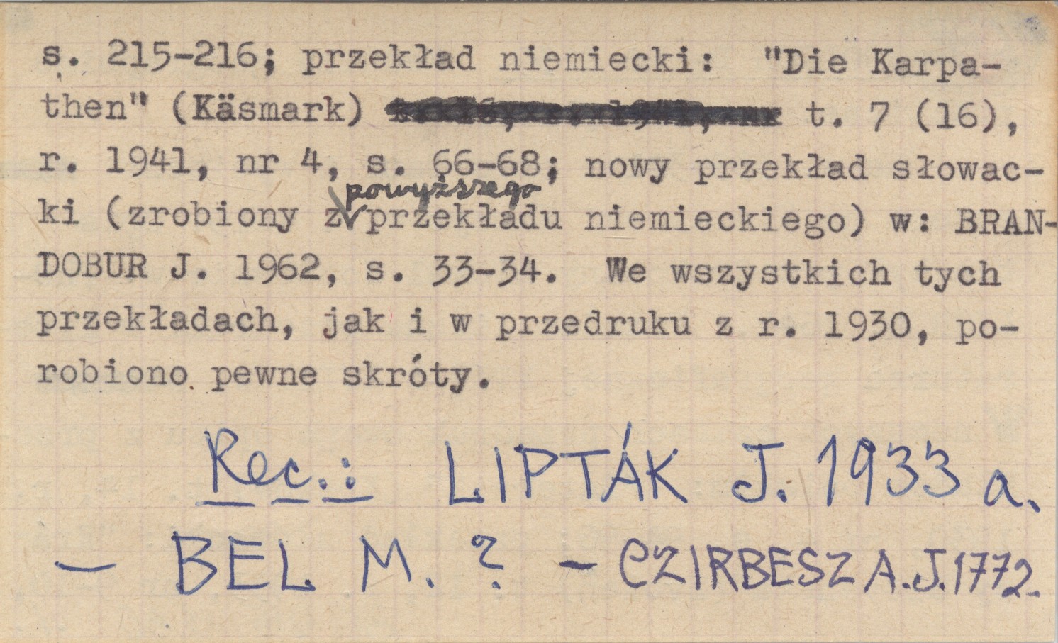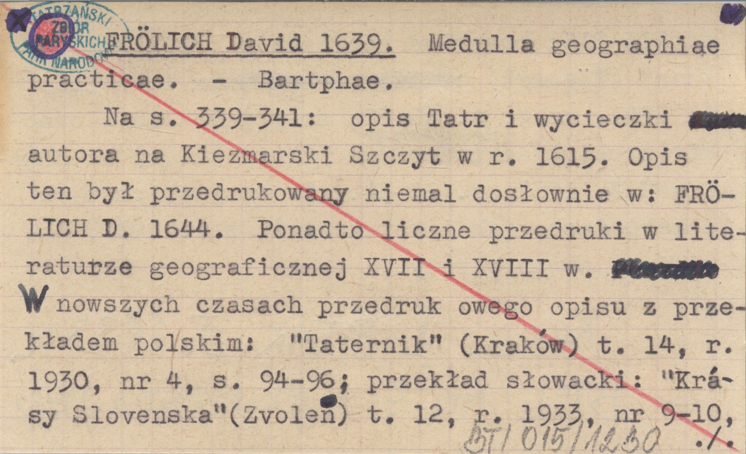 Bartphae, Na s. 339-341: opis Tatr i wycieczki autora na Kiezmarski Szczyt w r. 1615. Opis ten był przedrukowany niemal dosłownie w: FRÖLICH D. 1644. Ponadto liczne przedruki w literaturze geograficznej XVII i XVIII w. W nowszych czasach przedruk owego opisu z przekładem polskim: "Taternik" (Kraków) t. 14, r. 1930, nr 4, s. 94-96; przekład słowacki: "Krásy Slovenska" (Zvolen) t. 12, r. 1933, nr 9-10, s. 215-216; przekład niemiecki: "Die Karpathen" (Käsmark) t. 7 (16), r. 1941, nr 4, s. 66-68; nowy przekład słowacki (zrobiony z powyższego przekładu niemieckiego) w: BRANDOBUR J. 1962, s. 33-34. We wszystkich tych przekładach, jak i w przedruku z r. 1930, porobiono pewne skróty. REC: LIPTÁK J. 1933 a ; BEL M. ; CZIRBESZ A. J. 1772 ;
