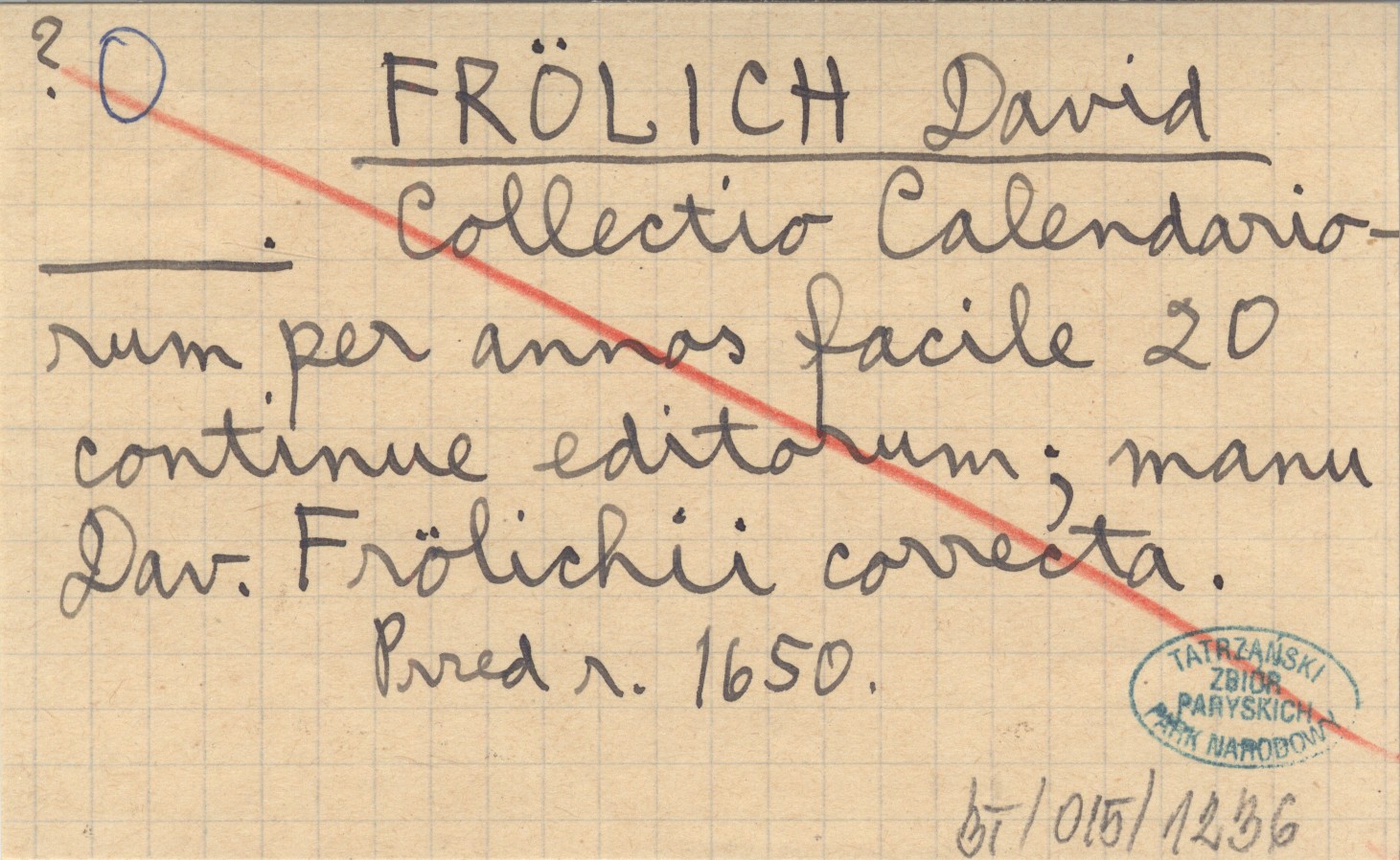FRÖLICH David przed 1650 Collectio Calendariorum per annas facile 20 continue editorum; manu Dav. Frölichii correcta.