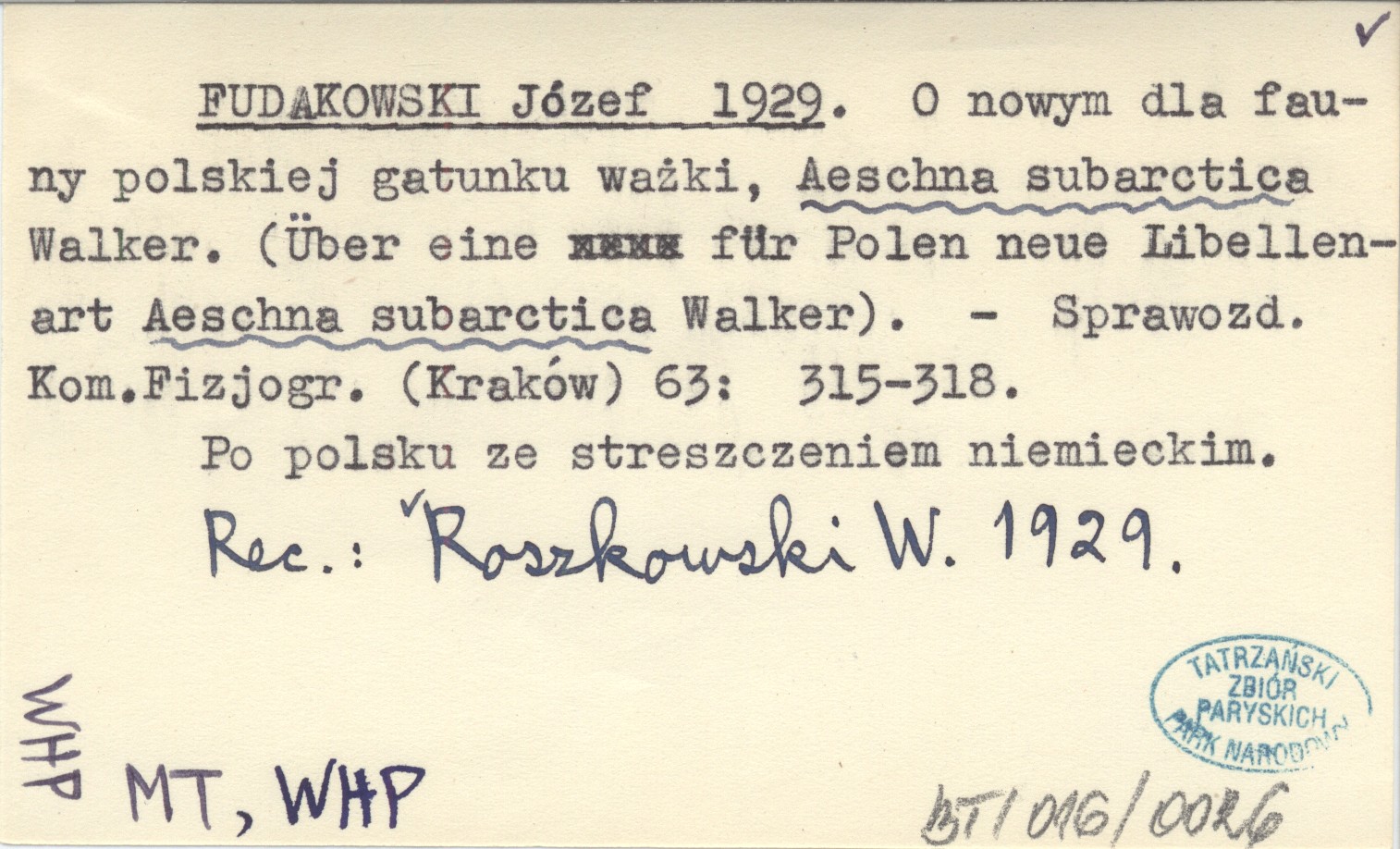FUDAKOWSKI Józef 1929 O nowym dla fauny polskiej gatunku ważki, Aeschna subarctica Walker. (Über eine für Polen neue Libellenart Aeschna subarctica Walker).