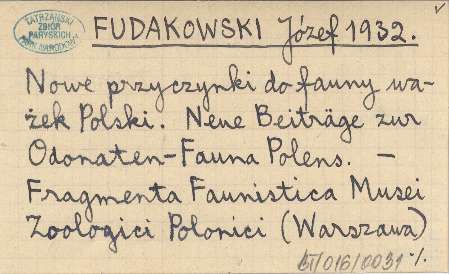 FUDAKOWSKI Józef 1932 Nowe przyczynki do fauny ważek Polski. Neue Beiträge zur Odonaten-Fauna Polens.