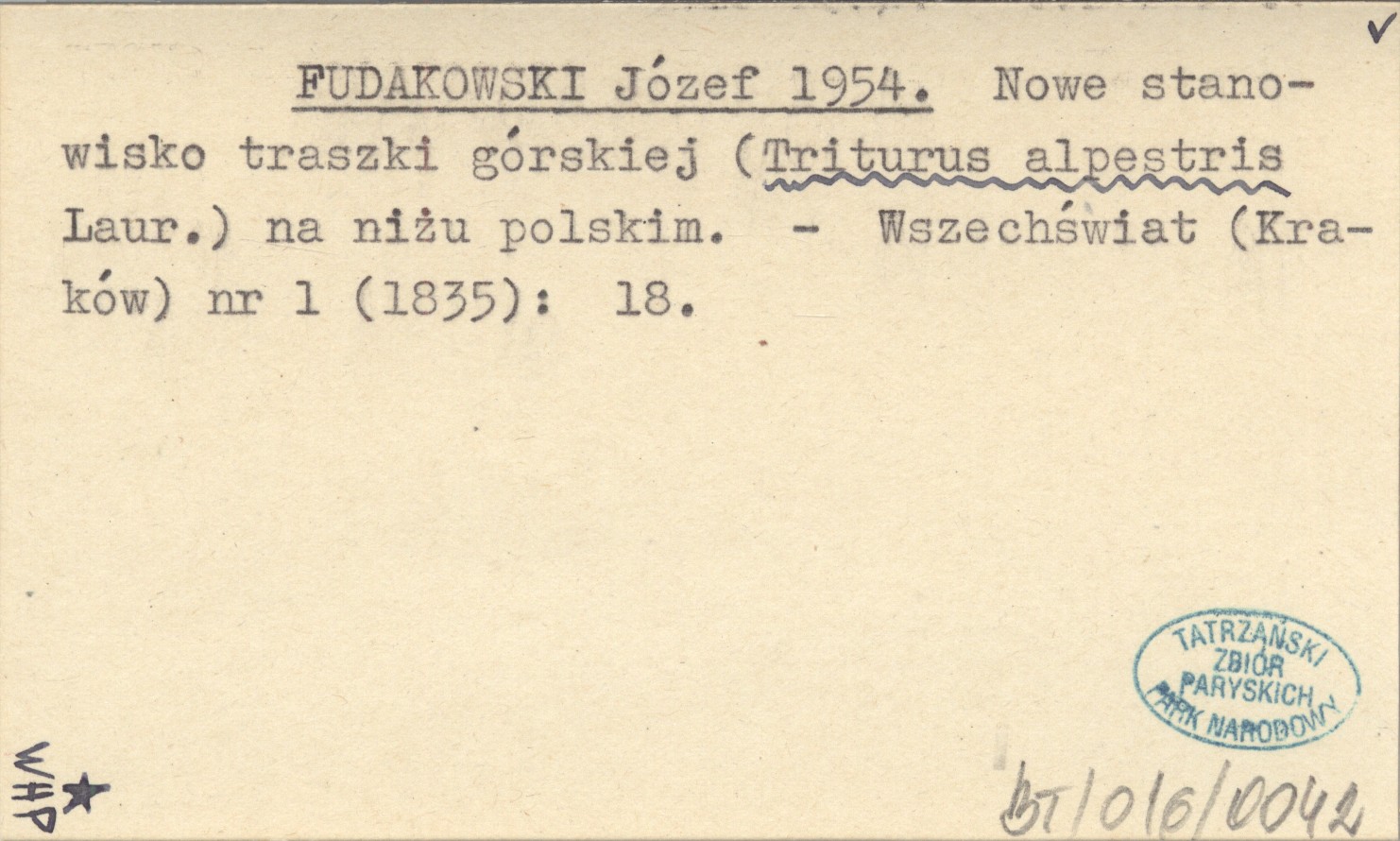 FUDAKOWSKI Józef 1954 Nowe stanowisko traszki górskiej (Triturus alpestris Laur.) na niżu polskim.